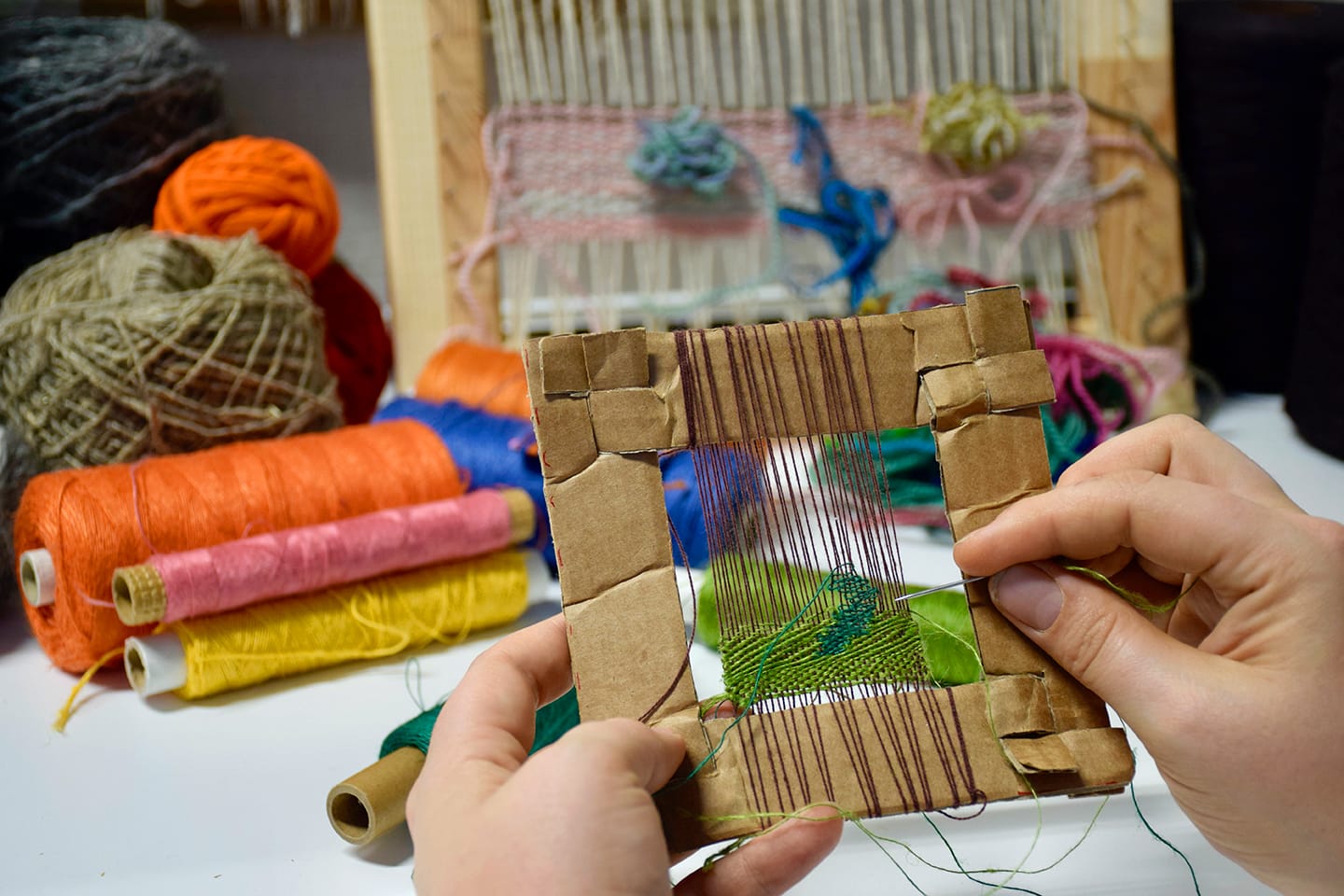 Utforska vävning i ram och utanför vävstolen. Prova att väva snabbskisser på kartong eller att väva in objekt till mjuka skulpturer. Vi prövar att väva i klassisk vävram och på egenbyggda lösningar. Leker med vävning som skissmetod och som konstnärligt uttryck. Under kursen pratar vi tillsammans om enkla material, olika vävtekniker och möjligheten att väva överallt.