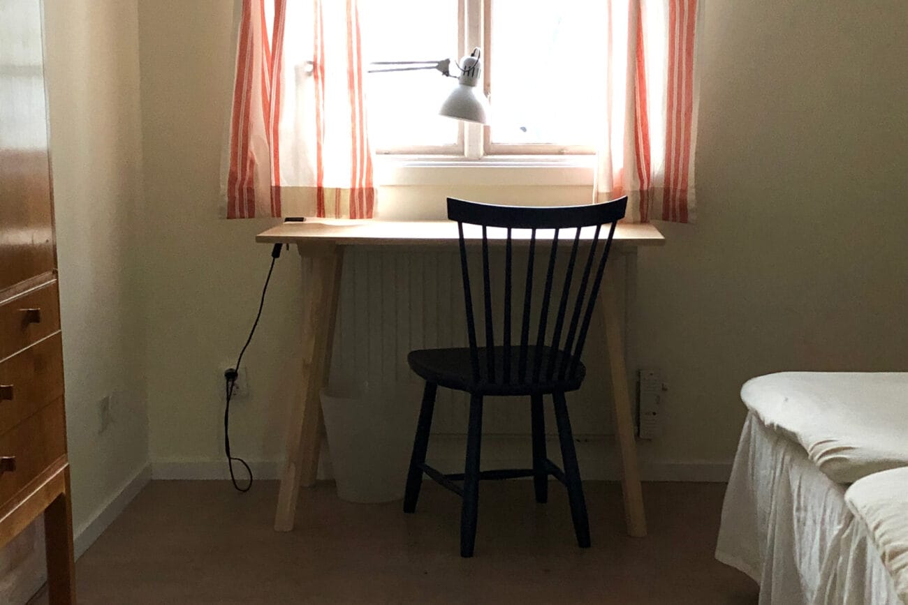 Rummet hyrs möblerat och är utrustat med en säng, täcke och kudde (om du vill får du ta med eget), skrivbord, stol, spegel och garderob eller byrå. Allt förbrukningsmaterial som tvättmedel, diskmedel, tvål, toalettpapper med mera ansvarar boende själva för. Du tar själv med dig bäddtextilier, handdukar och enklare skafferi i samband med inflytt.